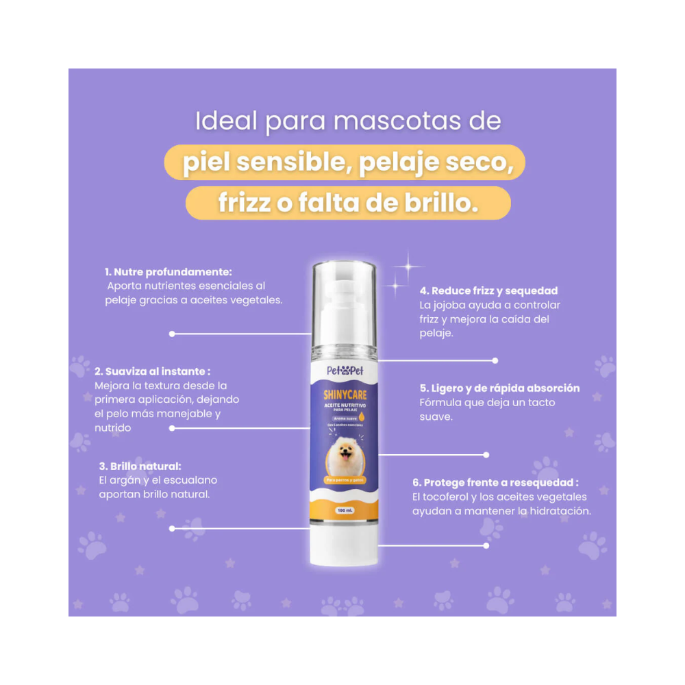Producto de uso cosmético para el cuidado externo del pelaje. Su fórmula combina aceites de origen natural y vitamina E para apoyar la apariencia y suavidad del pelo en perros y gatos. Se recomienda usar una cantidad moderada para evitar exceso de producto, especialmente en pelajes finos.