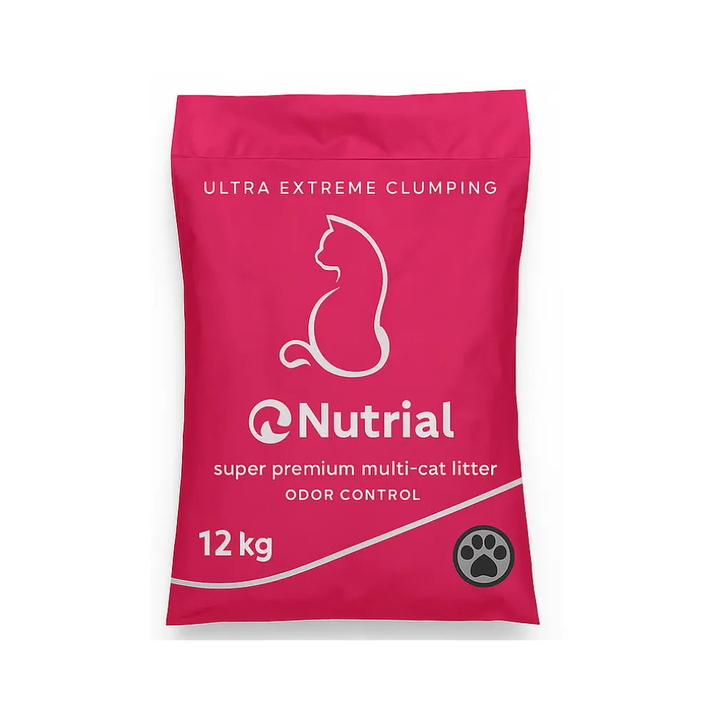 Arena sanitaria Nutrial 12 Kg, de alto poder aglutinante gracias a su fórmula exclusiva de bentonita seleccionada.