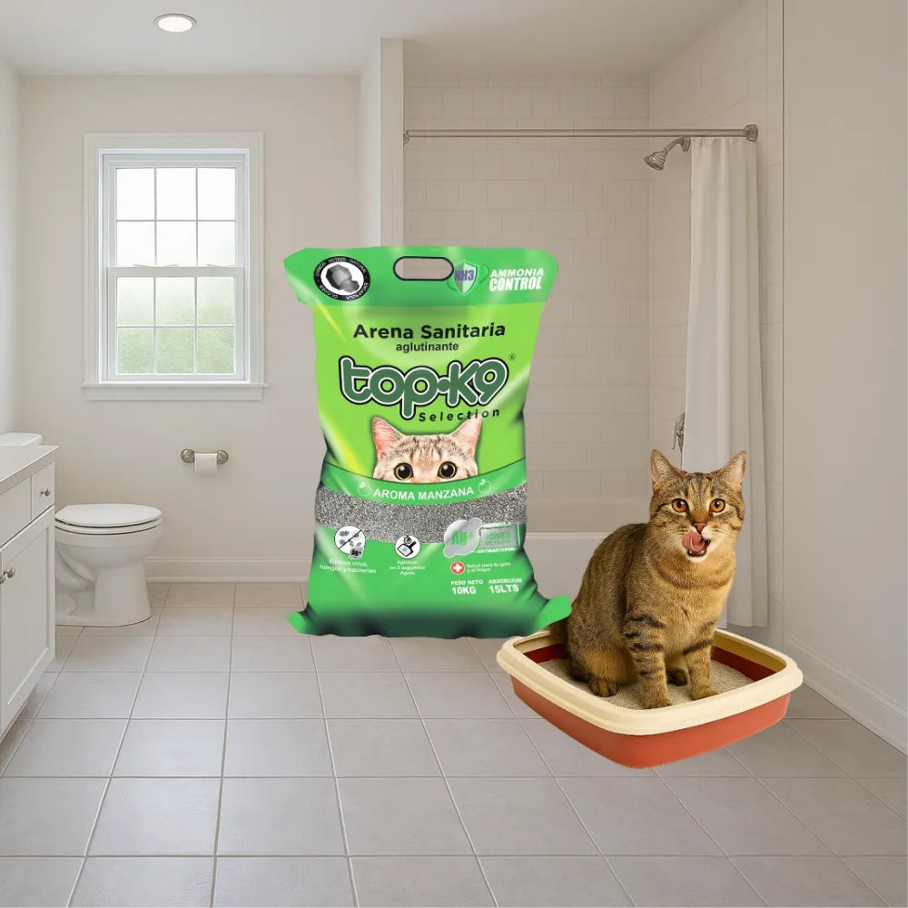 Mantener una altura de 8 a 10 cm en el arenero. Retirar desechos al menos dos veces al día.Transforma el arenero en un espacio limpio, seguro y aromático. Elige Top K9 Manzana con iones de plata y cuida la salud de tus gatos y tu hogar.