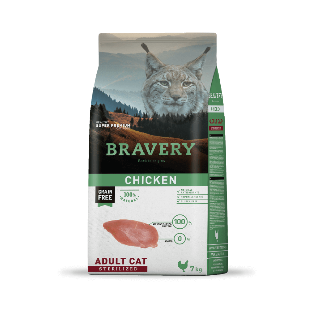 Bravery Gato Adulto Esterilizado Pollo es un alimento super premium sin cereales, formulado con pollo como única fuente de proteína animal, diseñado especialmente para gatos esterilizados adultos de todas las razas. Su receta hipoalergénica y rica en nutrientes ayuda a controlar el peso, mantener la masa muscular y favorecer la salud de la piel y el pelaje.