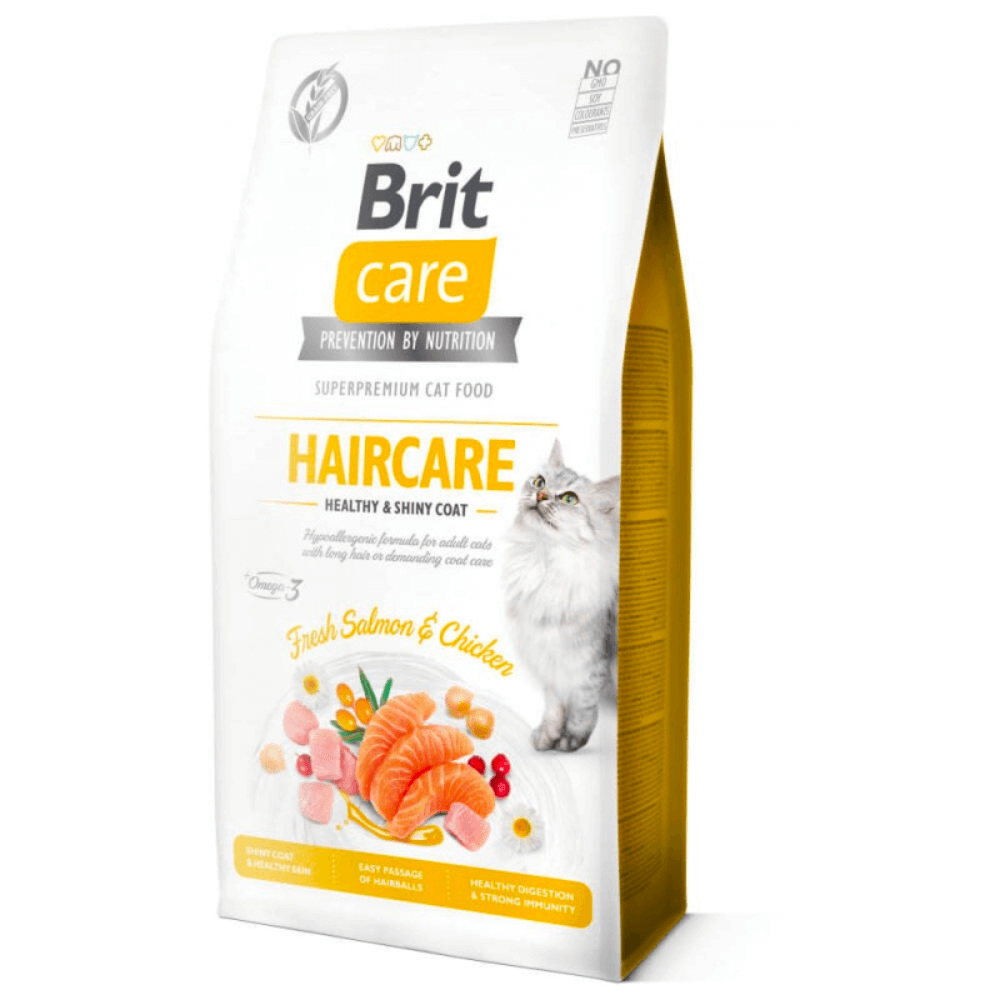 Brit Care Cat Haircare Healthy and Shinny Coat es un alimento hipoalergénico indicado para gatos adultos con cuidados exigentes de piel y pelaje. Formulado con carne de salmón fresca (26%) y fuentes naturales de ácidos grasos omega-3 y omega-6. Alimento rico en fibra contribuyen a facilitar el paso de las bolas de pelo. La fibra soluble crea la sensación de plenitud, que resulta en una reducción en la ingesta de alimentos y control de peso. Libre de cereales, SIN colorantes, SIN conservantes, SIN OMG y SIN soja.