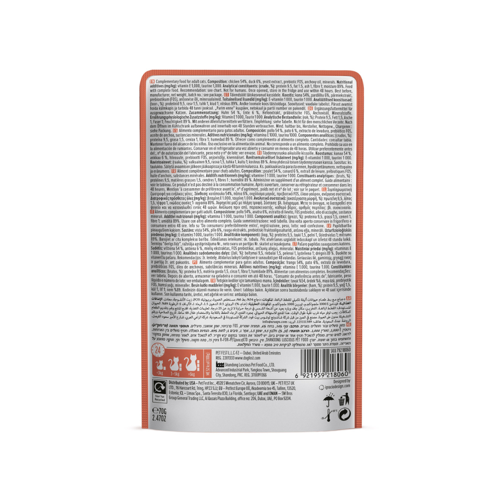 Sin colorantes, conservantes ni potenciadores del sabor. No contiene granos, maíz, soja, gluten, subproductos ni OGM. La taurina afecta positivamente el corazón, la visión, el oído y el sistema inmunológico del gato. Los ácidos grasos Omega-3 y Omega-6 de las anchoas promueven el crecimiento de un pelaje hermoso y saludable, además de fortalecer las articulaciones y los dientes. La achicoria reduce el olor de los excrementos de los gatos, ayudando a mantener el aire fresco alrededor de la caja de arena.