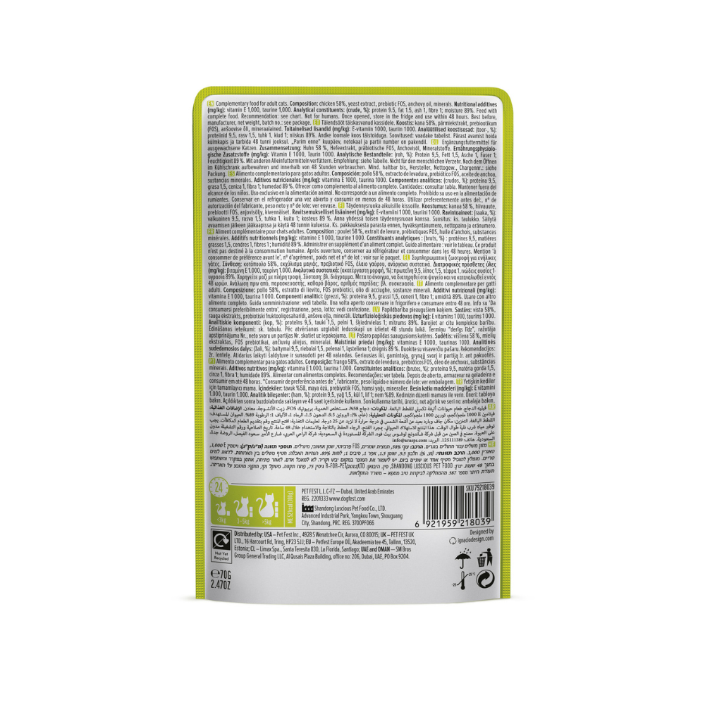 Servido como alimento complementario, la proteína del pollo contiene múltiples niveles de aminoácidos, como lisina, fenilalanina, arginina y Taurina. Gran sabor de esta tierna carne de pechuga junto con Los beneficios naturales para la salud lo convierten en una excelente comida diaria para los gatos.