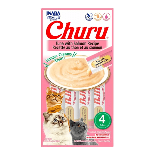 Churu Atún Y Salmón (paquete conteniendo 4 tubitos), es un novedoso y delicioso snack para gatos de textura cremosa (puré) y alta palatabilidad. Tiene un alto contenido de humedad lo que encanta a los gatos y además contribuye a su hidratación