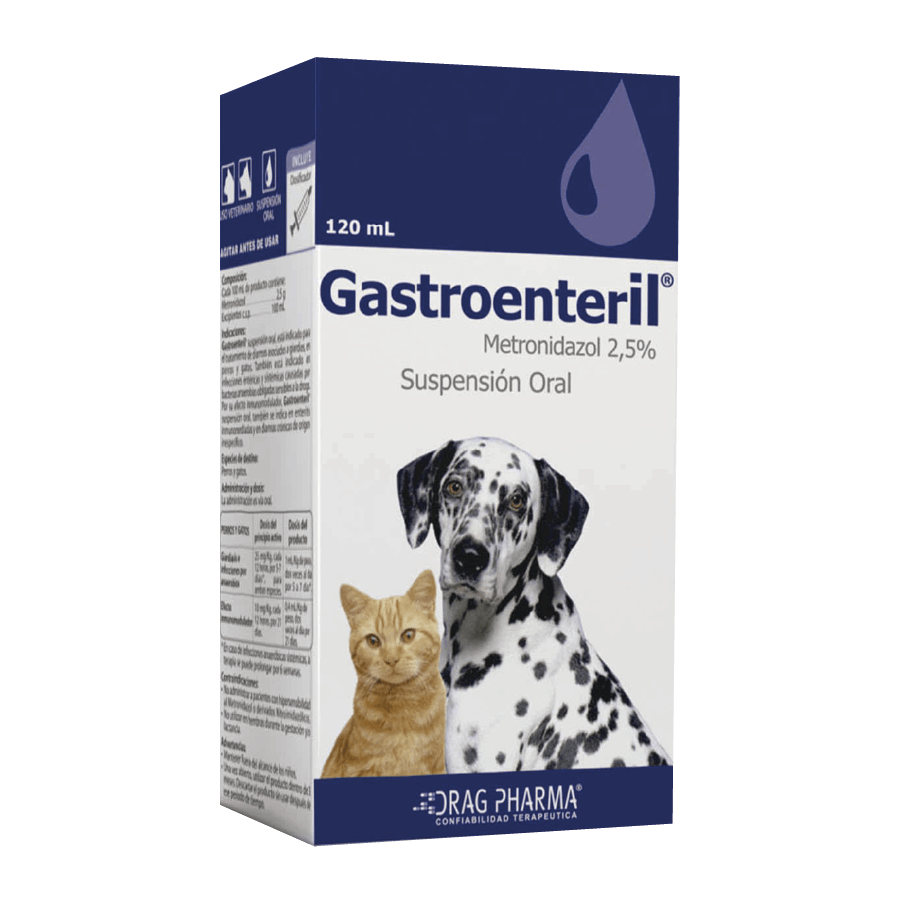 Gastroenteril suspensión oral, está indicado para el tratamiento de diarreas asociadas a giardias, en perros y gatos. También está indicado en infecciones entéricas y sistémicas causadas por bacterias anaerobias obligadas sensibles al Metronidazol.