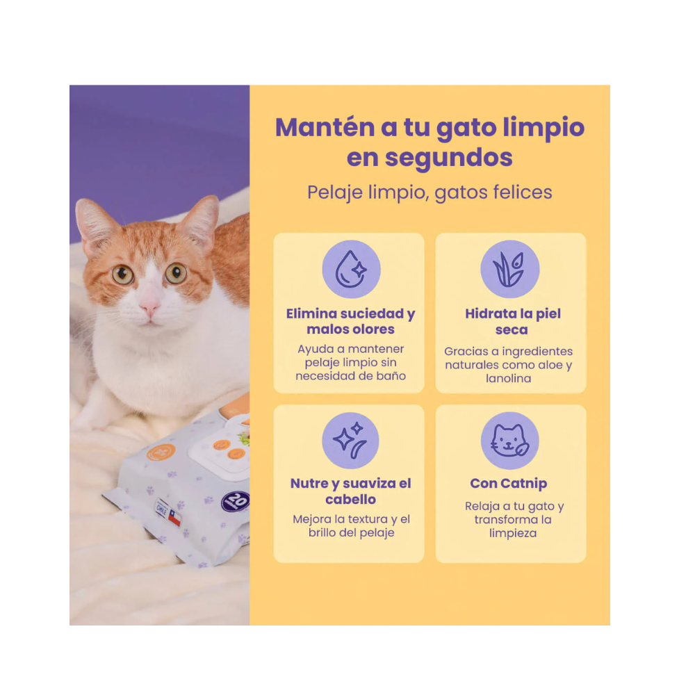 Cat Gloves está pensado especialmente para la higiene regular de gatos. Su formato facilita una limpieza localizada o general, y su composición no contiene alcohol, parabenos ni fragancias añadidas, según lo declarado por la marca.