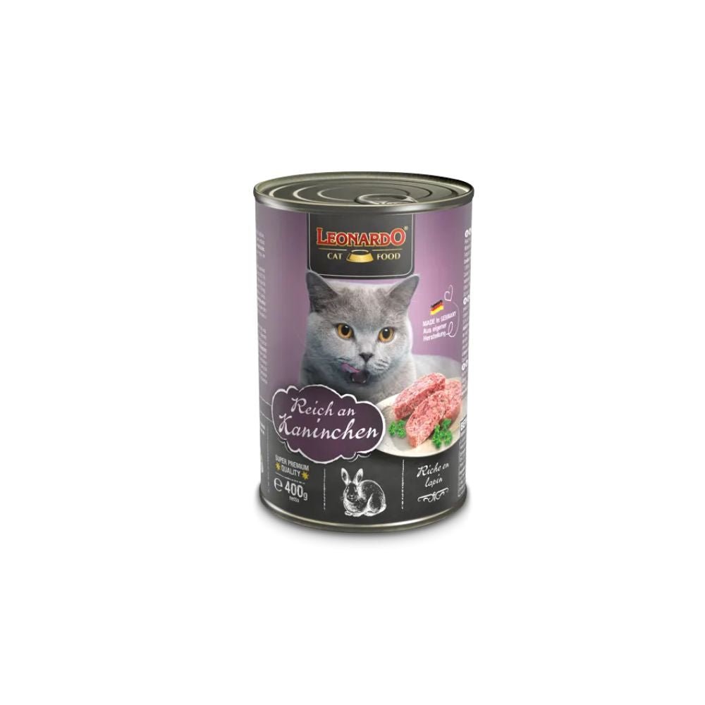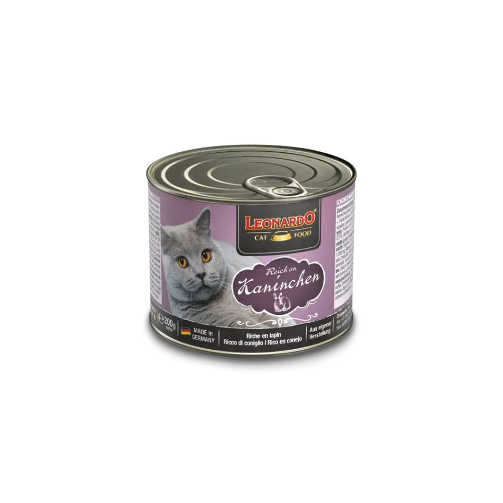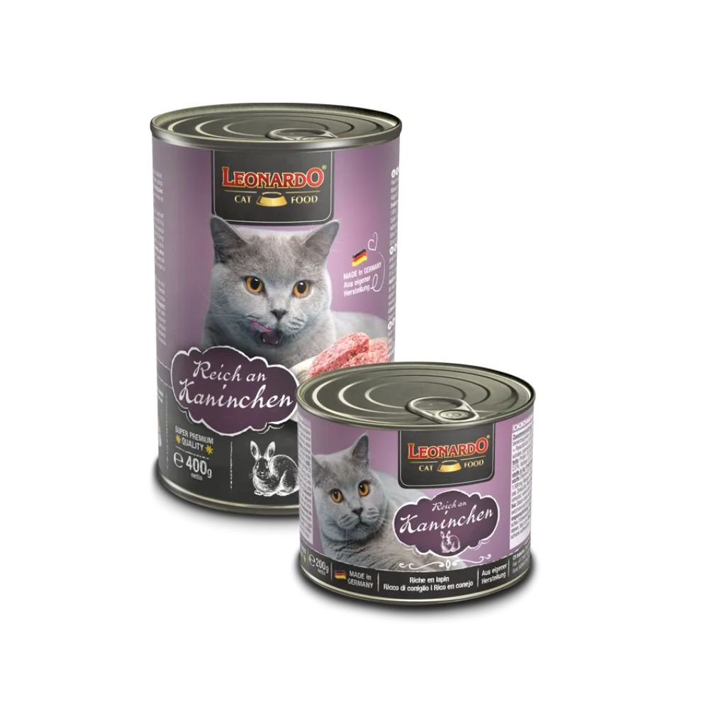 LEONARDO Quality Selection Leber es un alimento húmedo en lata indicado para gatos adultos rico en conejo. En su fórmula solamente se utilizan productos cárnicos frescos. Gracias a la alta disponibilidad biológica y a la alta calidad de estos productos, su gato necesita una cantidad relativamente pequeña para satisfacer sus necesidades nutricionales diarias. Latas de 200 y 400 g.
