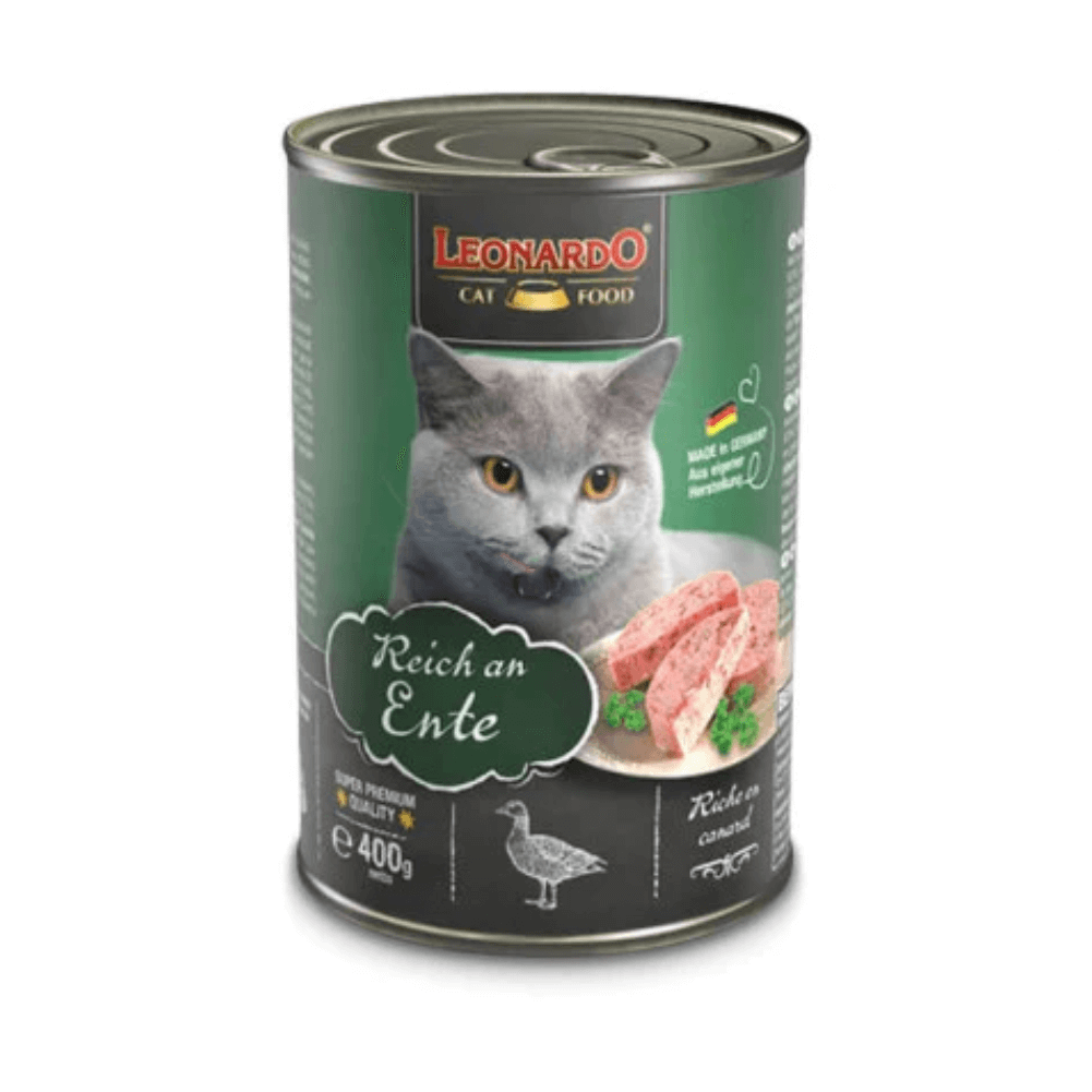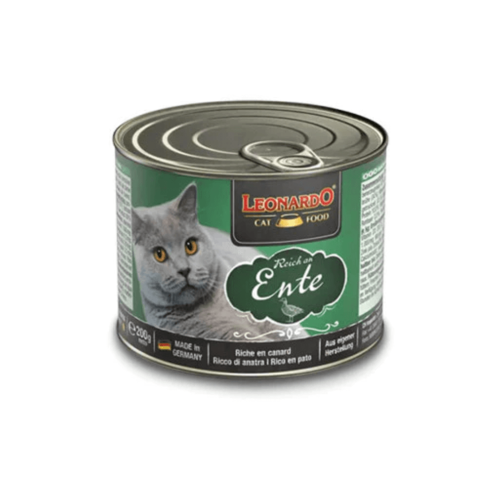 Leonardo Quality Selection Pato, es un alimento húmedo para gatos adultos. Este sabroso alimento húmedo de origen alemán, contiene carne pato y un alto nivel de ácidos grasos esenciales y minerales.
