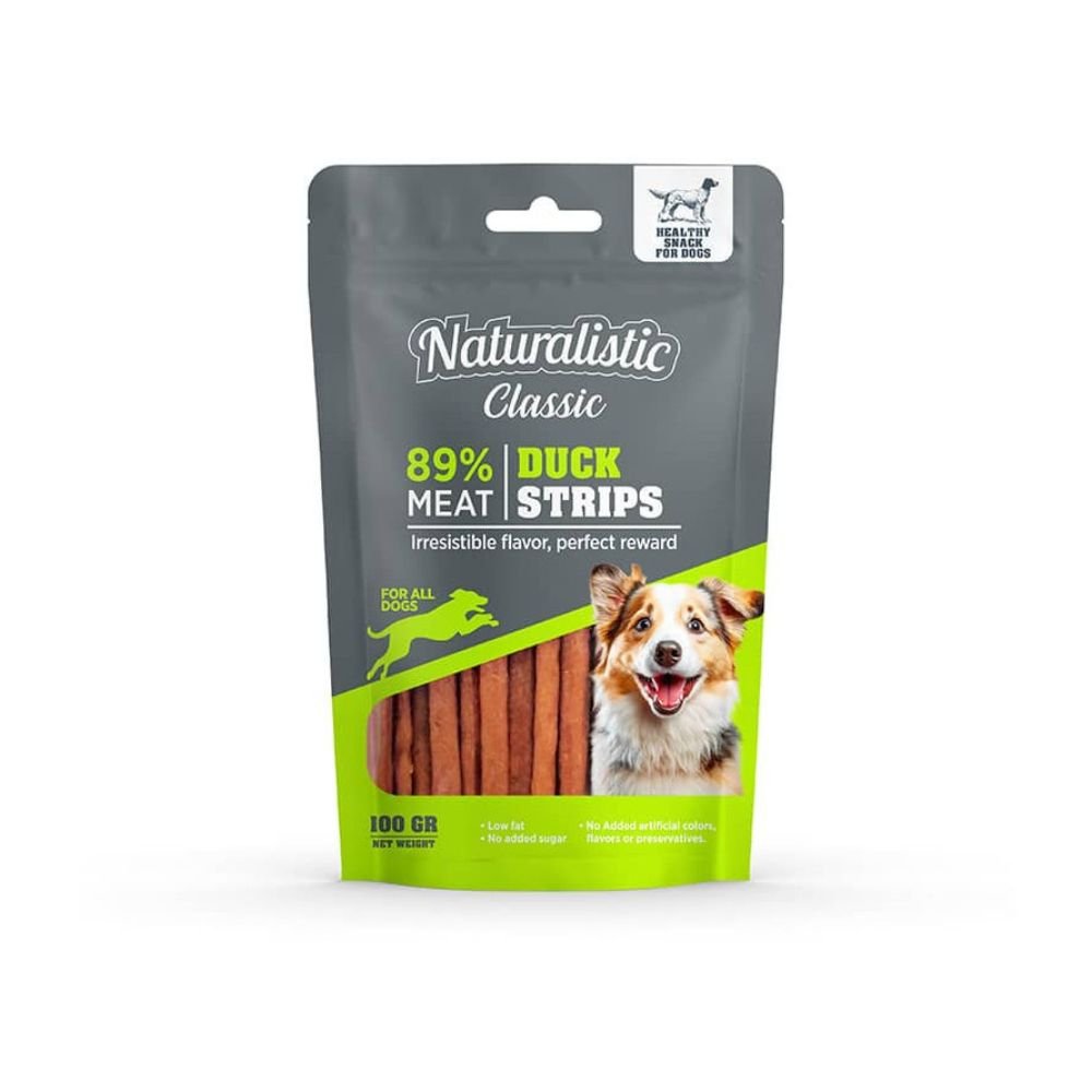 Naturalistic Classic Duck Strips son unos premios ideales para todos los perros y todos los tamaños. Formulados con pechuga de pato, proteína indicada para perros con alergias alimentarias o sensibilidades digestivas. Con más de 89% de carne y bajo en grasas. Alto contenido de Omega 3 y 6. Libre de: Gluten (Maíz), azúcar adicionada, colorantes y conservantes artificiales. Gran palatabilidad. Bolsa de 100g