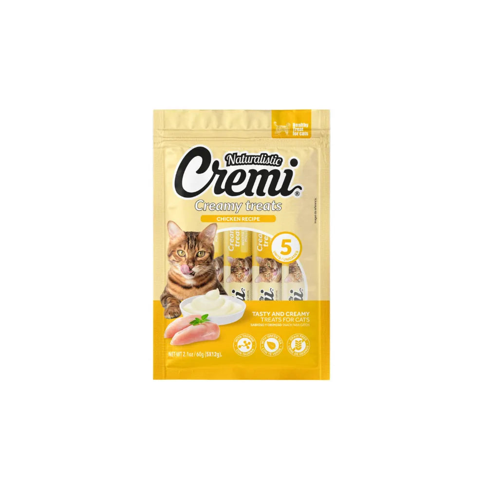 Snack cremoso para gatos de todas las edades. Elaborado con carne de pollo, y reforzado con taurina aminoácido esencial para los gatos. La fórmula además contiene extracto de té verde que tiene un alto poder antioxidante. El alto porcentaje de humedad promueve la hidratación junto con un aporte calórico controlado de sólo 6.9 kcal por tubo de Cremi. Excelente opción para utilizarlo con juguetes interactivos, congelarlo en épocas de calor o reducir el estrés al momento de dar un medicamento. Cremi es la mejor opción para fortalecer el vínculo con tu gato.