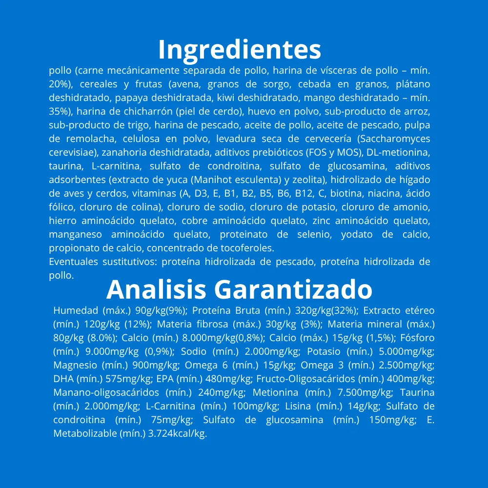 - Prebióticos naturales (FOS y MOS) que equilibran la flora intestinal.