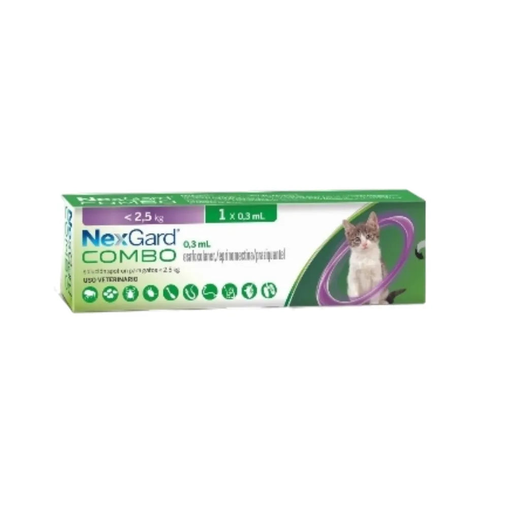 NexGard Combo Gato 0,8 – 2,5 Kg es un antiparasitario tópico de amplio espectro que ofrece protección mensual contra pulgas, garrapatas, ácaros, gusano del corazón y parásitos intestinales. Su aplicación en pipeta es segura y práctica, ideal para gatos pequeños y gatitos a partir de las 8 semanas.