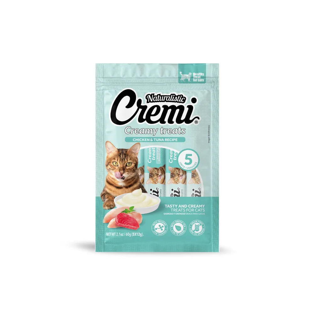 Snack cremoso para gatos de todas Las edades. Elaborado con carne de pollo y atún, y reforzado con taurina aminoácido esencial para los gatos. La fórmula además contiene extracto de té verde que tiene un alto poder antioxidante. El alto porcentaje de humedad promueve la hidratación junto con un aporte calórico controlado de sólo 6.9 kcal por tubo de Cremi. Excelente opción para utilizarlo con juguetes interactivos, congelarlo en épocas de calor o reducir el estrés al momento de dar un medicamento. Cremi es la mejor opción para fortalecer el vínculo con tu gato.