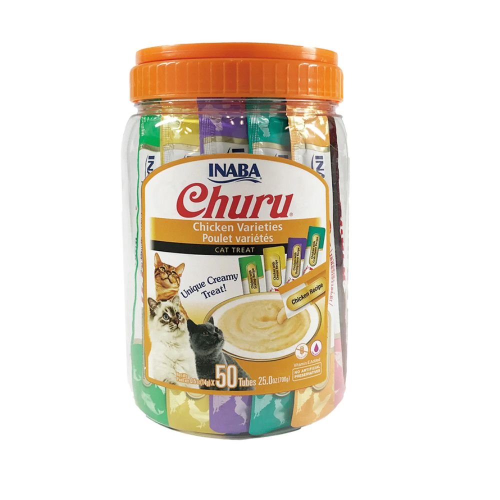 Churu Variedades de pollo 50 unidades. Estos sabrosos snacks para gatos se hacen con atún silvestre o pollo criado en granjas puro y natural. Disponibles en nueve variedades deliciosas, tienen el alto contenido de humedad necesario para la salud de los felinos. También puede verterlo en un plato o añadirlo por encima de alimentos húmedos o secos.