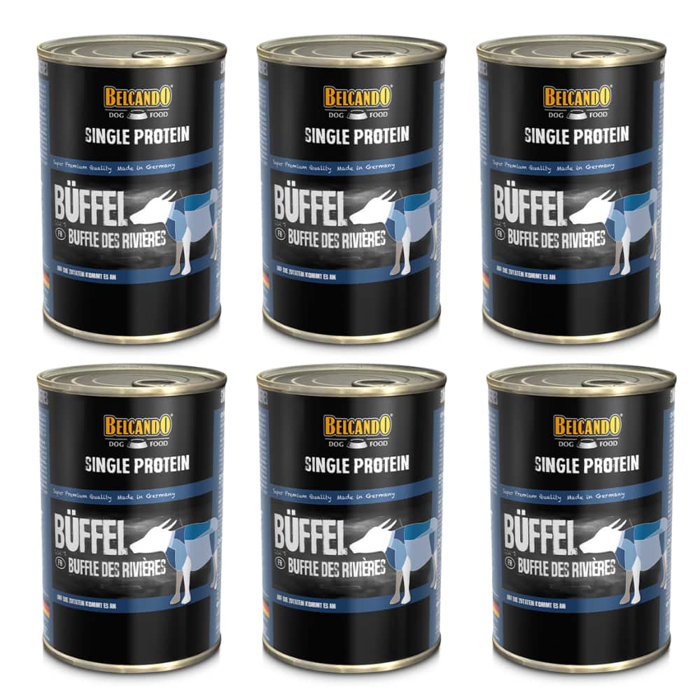 6 unidades Belcando Lata Single Protein Búfalo 400grBELCANDO® Single Protein Bufalo es un sabroso alimento húmedo y calidad superpremium para perros de todas las edades. Formulado con ingredientes procedentes de la agricultura alemana controlada. No utilizan despiece, solamente piezas enteras que son cuidadosamente cocinadas.Se puede utilizar como alimentación permanente en caso de intolerancias alimentarias.
