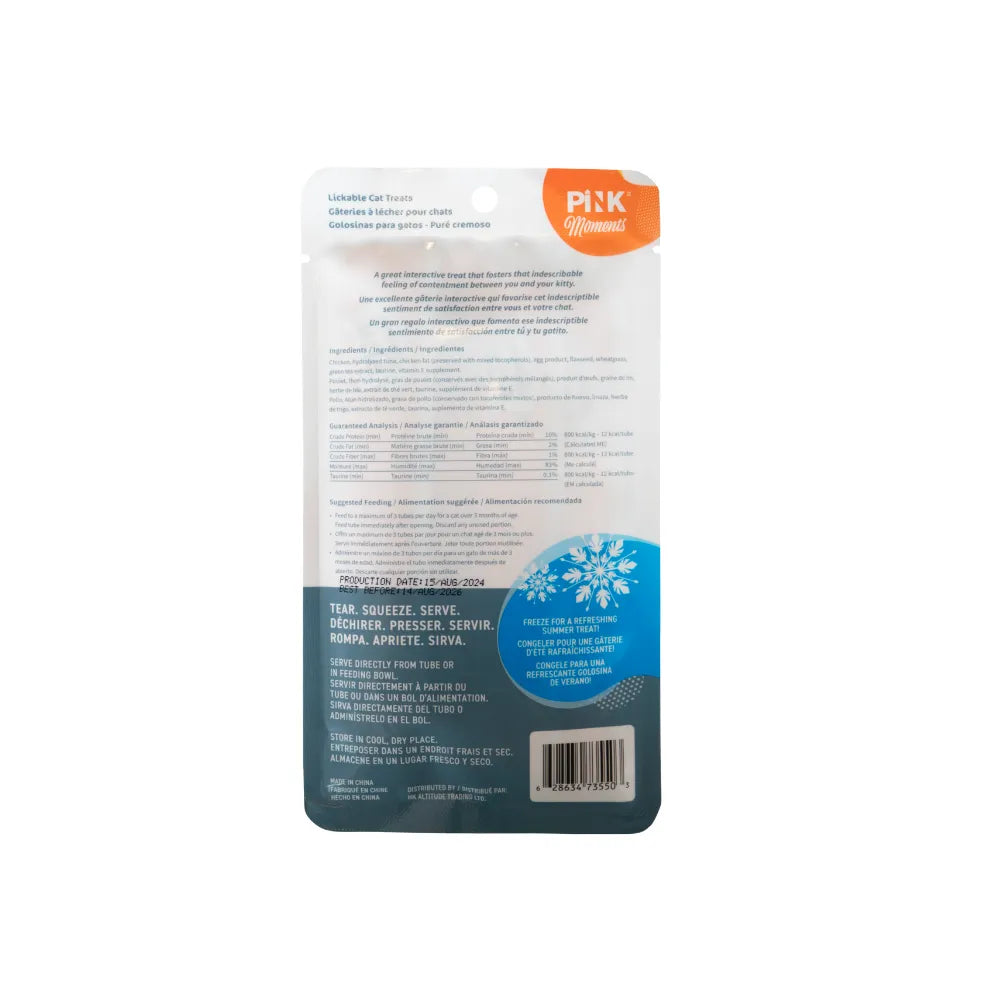 Pink Moments Pollo 4 Tubos es un snack cremoso para gatos, elaborado con pollo como ingrediente principal, ideal como premio, complemento de la dieta o para reforzar el vínculo con tu mascota. Su textura suave y palatable encanta a los gatos, aportando hidratación y nutrición en cada porción.