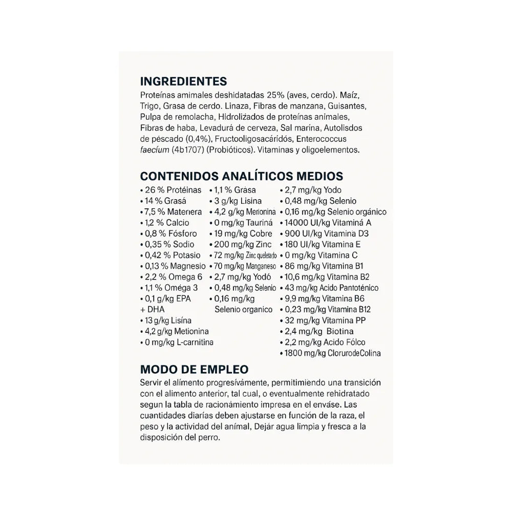 - Probióticos (Enterococcus faecium) que equilibran la flora intestinal.