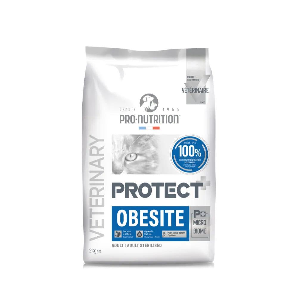 Protect Obesite Felino 2kges un alimento dietético completo formulado para gatos adultos con sobrepeso, obesidad o diabetes mellitus. Su fórmula hipocalórica (EM<3.000 kcal/kg) y rica en proteínas (36%) favorece la pérdida de grasa corporal sin comprometer la masa muscular.