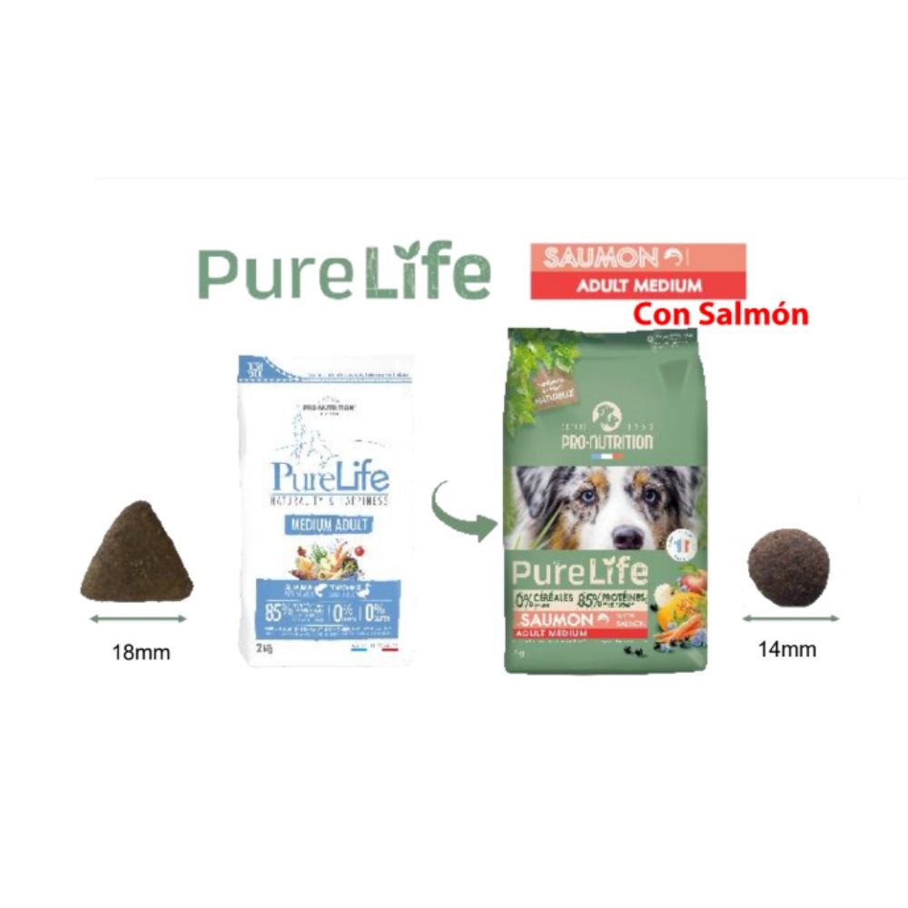 Pure Life Medium Adult para perros con salmón y pato es un alimento completo de alta calidad, recomendado para perros adultos de tamaño mediano de entre 10 y 30kg. Con un 85% de proteína animal de la carne y el pescado, frutas y verduras, ricas en vitaminas y antioxidantes, es un pienso rico en ácidos grasos Omega 3 y 6 para una piel y un pelo sanos, con todos los nutrientes que un perro adulto necesita para una buena salud.