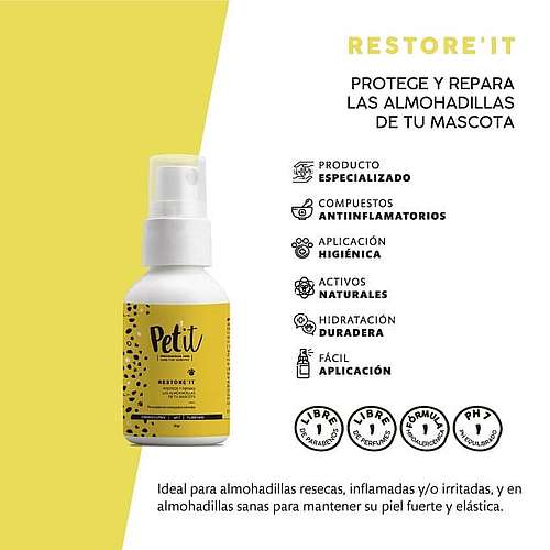 Pet’it Restore’it es un fluido W/O con 30 gramos contenidos en un exclusivo envase sprayable que focaliza la dispersión del producto, otorga la dosis justa a las almohadillas de tu mascota y evita la contaminación del producto.