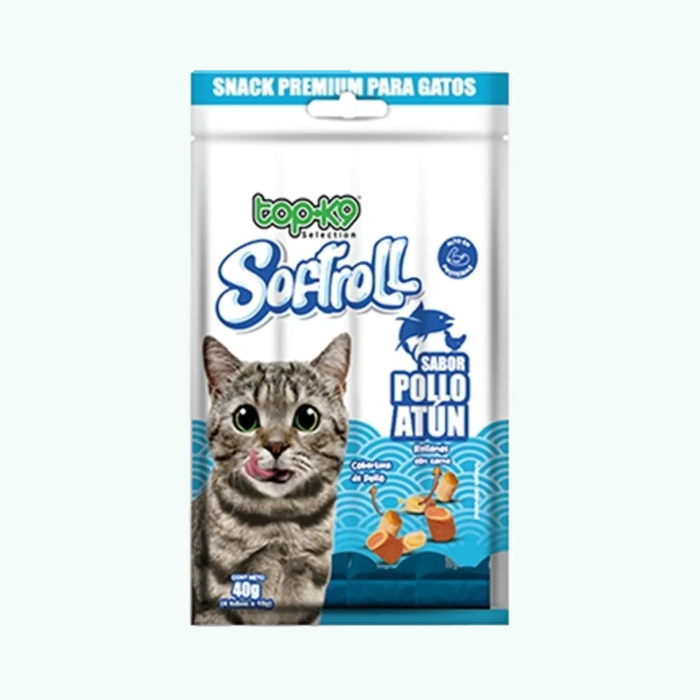 ElSnack Top K9 Softroll Atún 40 ges un capricho gourmet para tu gato. Suave por dentro, crujiente por fuera, fusiona atún relleno de carne y una cobertura de pollo, entregando una experiencia nutritiva y deliciosa en un solo bocado.