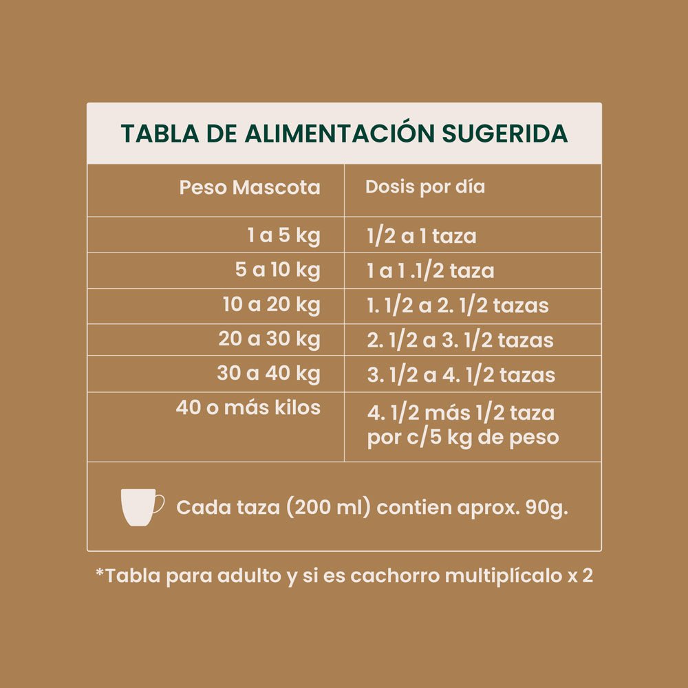 Servir seco directamente desde el envase. Ajustar la cantidad diaria según el peso, edad y nivel de actividad del perro. Mantener siempre agua fresca disponible.