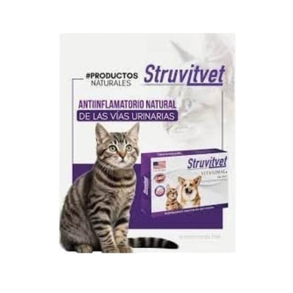Struvitvet Vitanimal es un producto de administración oral orientado al apoyo de las vías urinarias. Se recomienda su uso bajo supervisión veterinaria y como parte de una estrategia integral que puede incluir ajustes dietarios u otras medidas según diagnóstico.