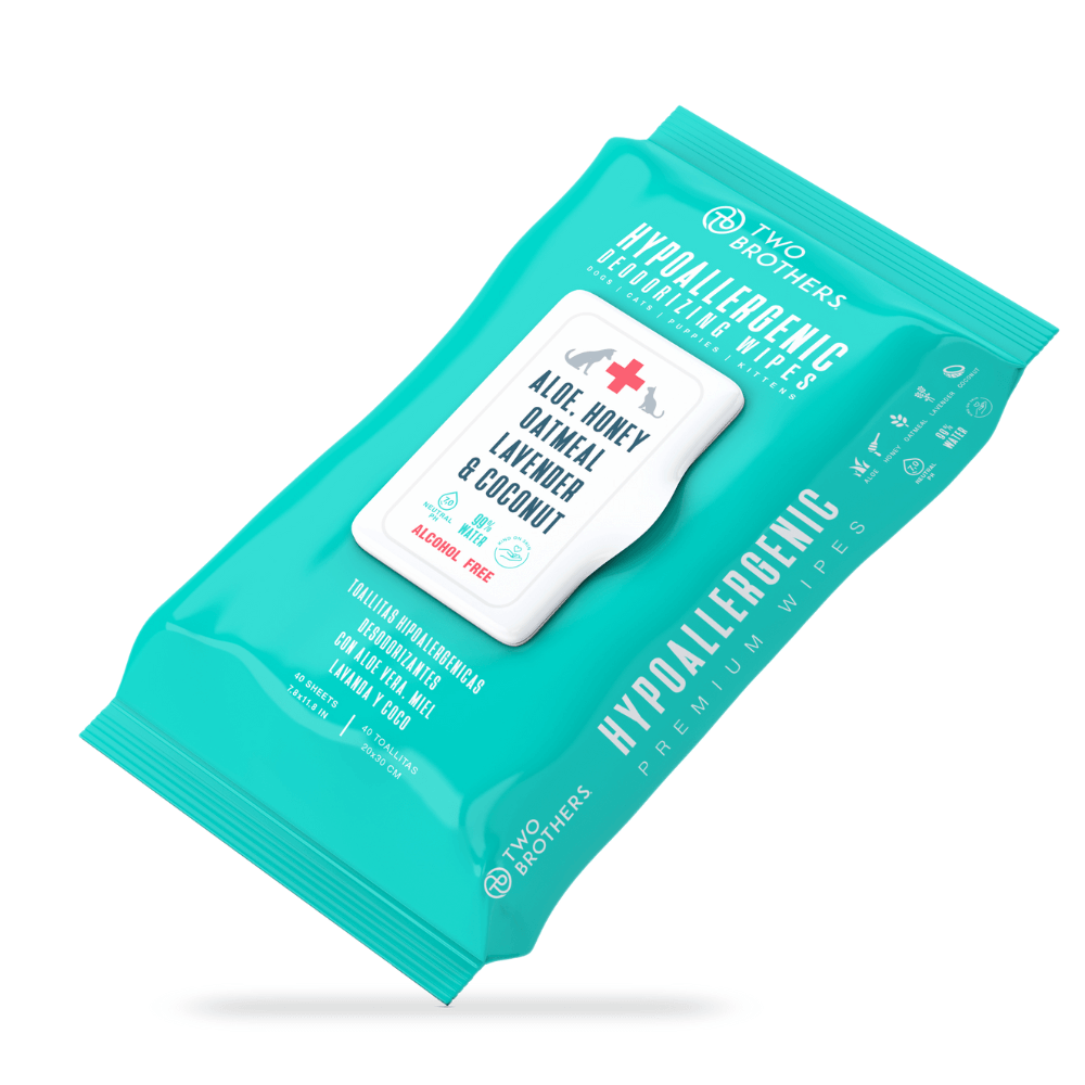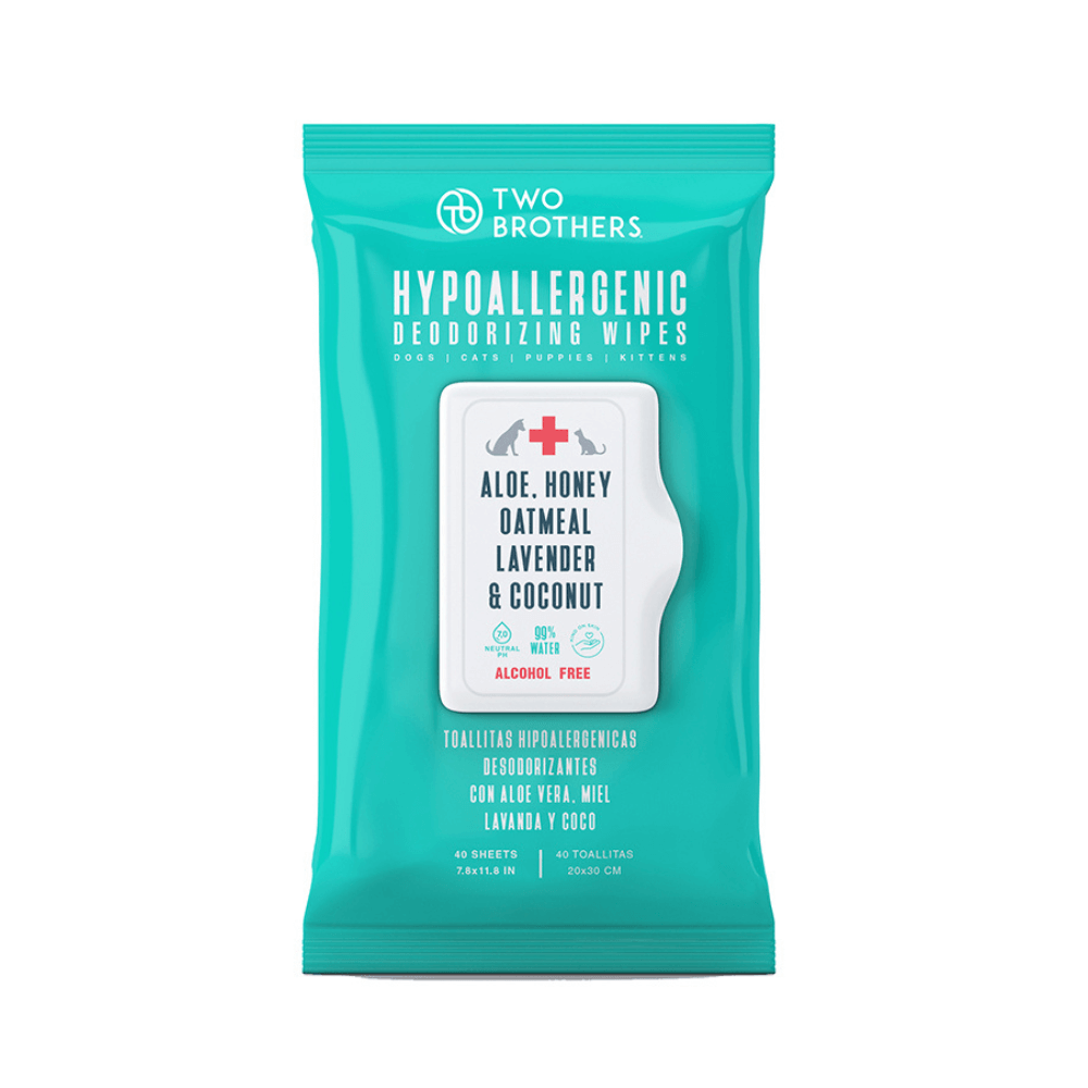 Two Brothers Hypoallergenic Wipes son unas toallitas hipoalergénicas desodorizantes con Aloe Vera, Miel, Avena, Lavanda y Coco. Fórmula libre de Alcohol, Parabenos y Fragancias, que ayuda a limpiar, hidratar y calmar, mientras deja un fresco aroma. No contienen Jabón, por lo que no interfieren con productos tópicos anti pulgas y garrapatas. pH Neutro, 99% agua.