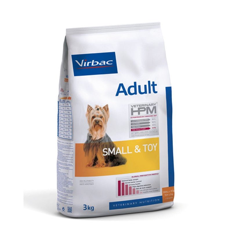 VIRBAC HPM Adult Dog Small & Toy está indicado para perros de razas pequeñas y miniatura (<10kg)no esterilizados a partir de los 10 meses de edad. Fórmula baja en hidratos de carbono y rica en proteínas diseñada para acercarse al máximo a las necesidades nutricionales de los carnívoros. El resultado es una nutrición que se adapta perfectamente a las necesidades de tu perro. 35% Rica en proteínas (con 89% de proteínas animales) 26% Bajo en carbohidratos.