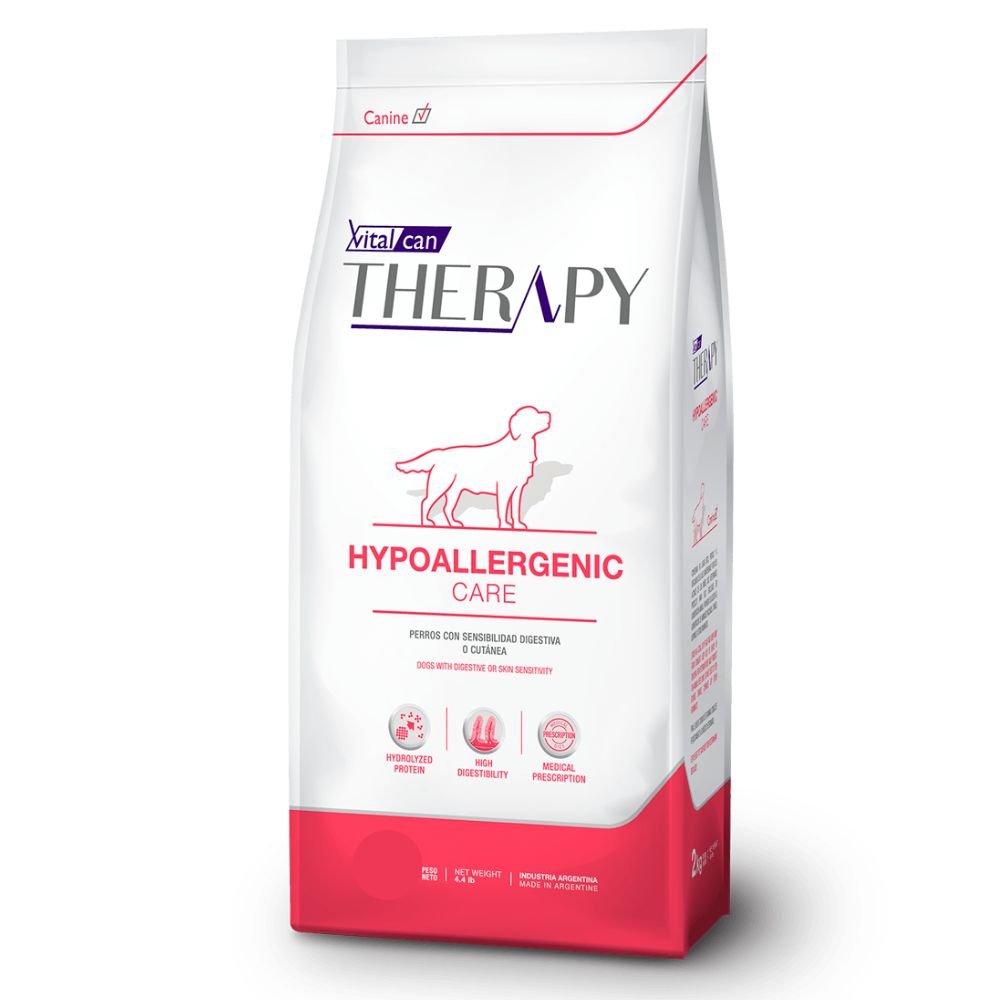 Vitalcan Therapy Canine Hypoallergenic Care es un alimento hipoalergénico completo de prescripción para perros de todas las edades que presentan alergia e intolerancia alimentaria con manifestaciones digestivas y/o cutáneas. Este alimento ha sido elaborado con proteínas hidrolizadas de bajo peso molecular y carbohidratos especialmente seleccionados para colaborar con el tratamiento de estas patologías. Croqueta de tamaño ideal para razas medianas y grandes.