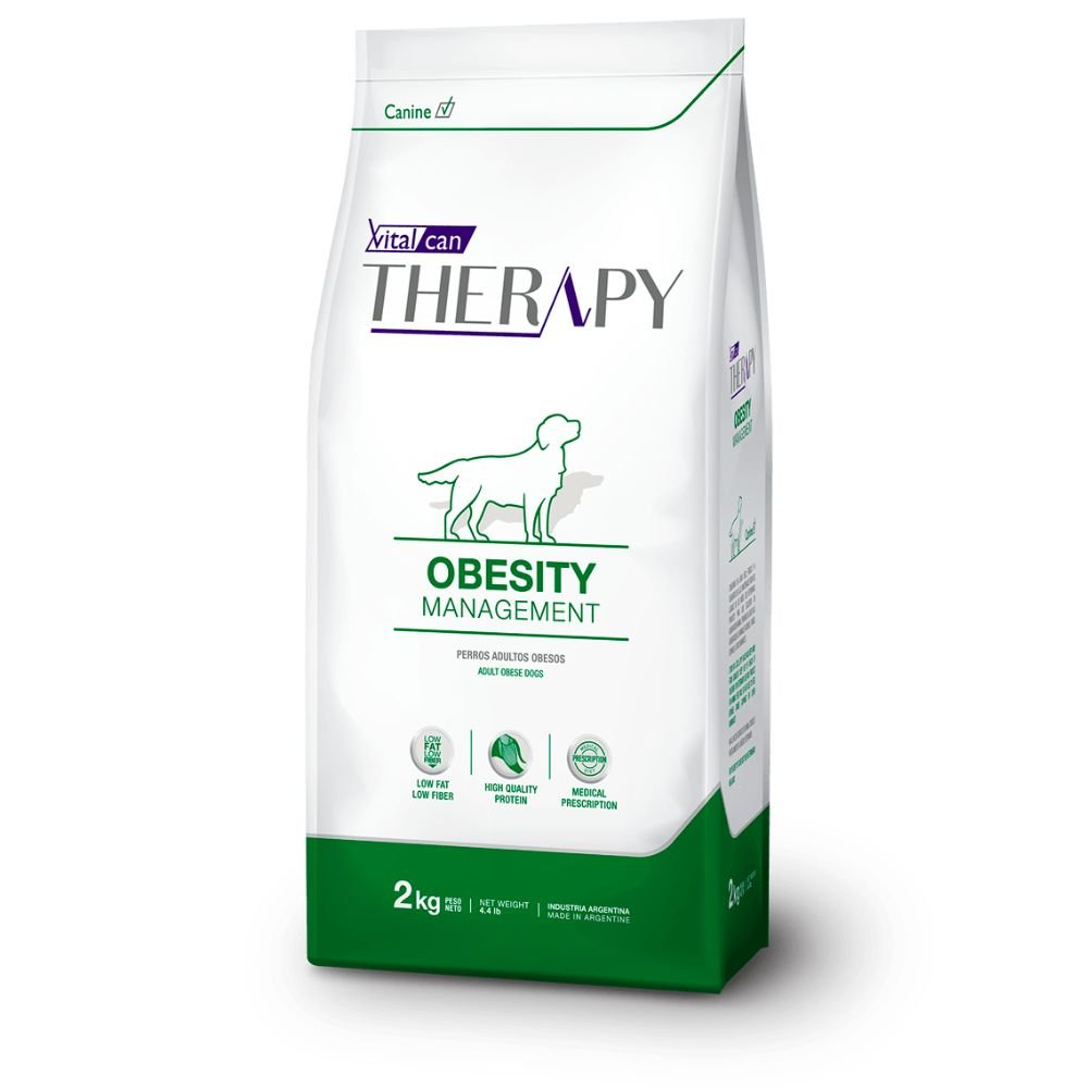 Vitalcan Therapy Canine Obesity Management es un alimento completo de prescripción para perros adultos obesos o con sobrepeso. Su elevado contenido de proteínas, reducido aporte de calorías y altos niveles de L-Carnitina colaboran en forma conjunta en el descenso eficaz del peso corporal.