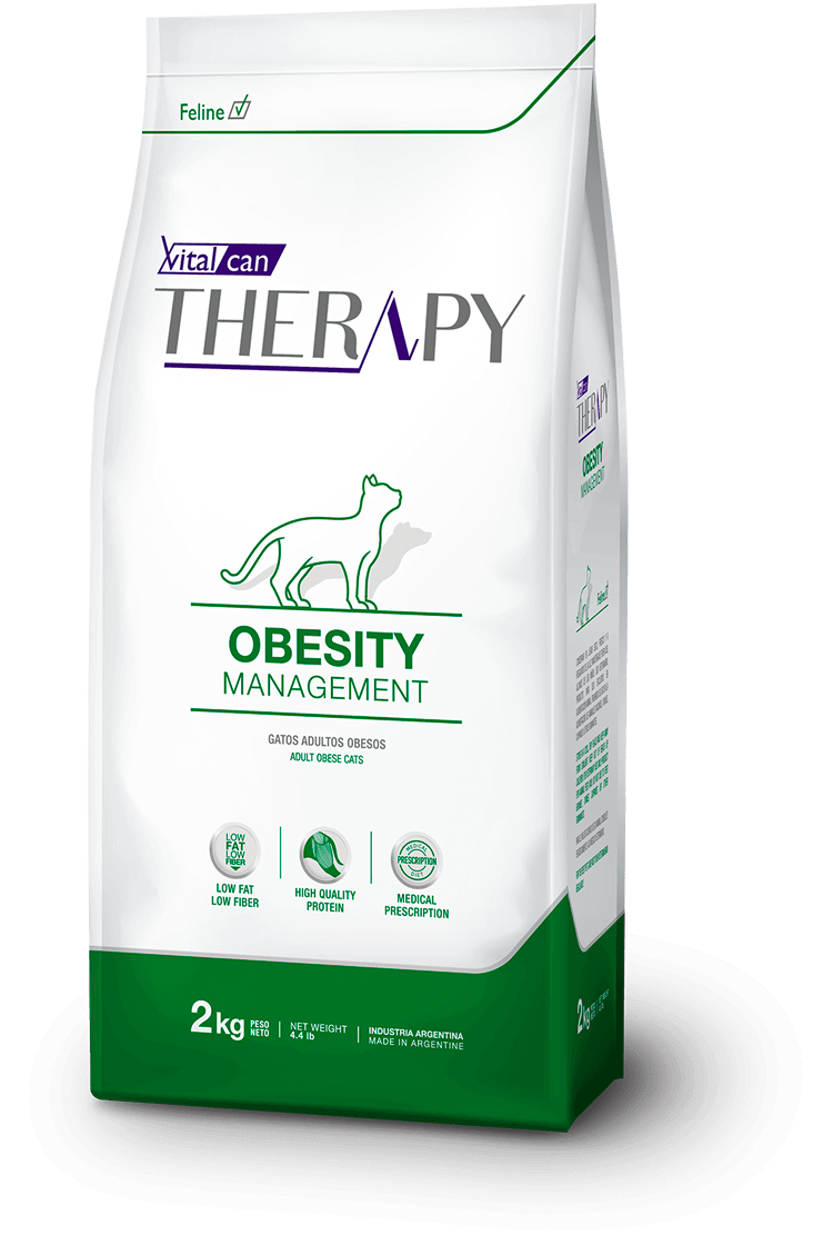 VITALCAN THERAPY FELINE OBESITY MANAGEMENT es un alimento completo de prescripción para gatos adultos obesos o con sobrepeso, formulado con un reducido nivel de calorías y un adecuado aporte de fibras dietarias, que colabora en el descenso del peso corporal del gato.
